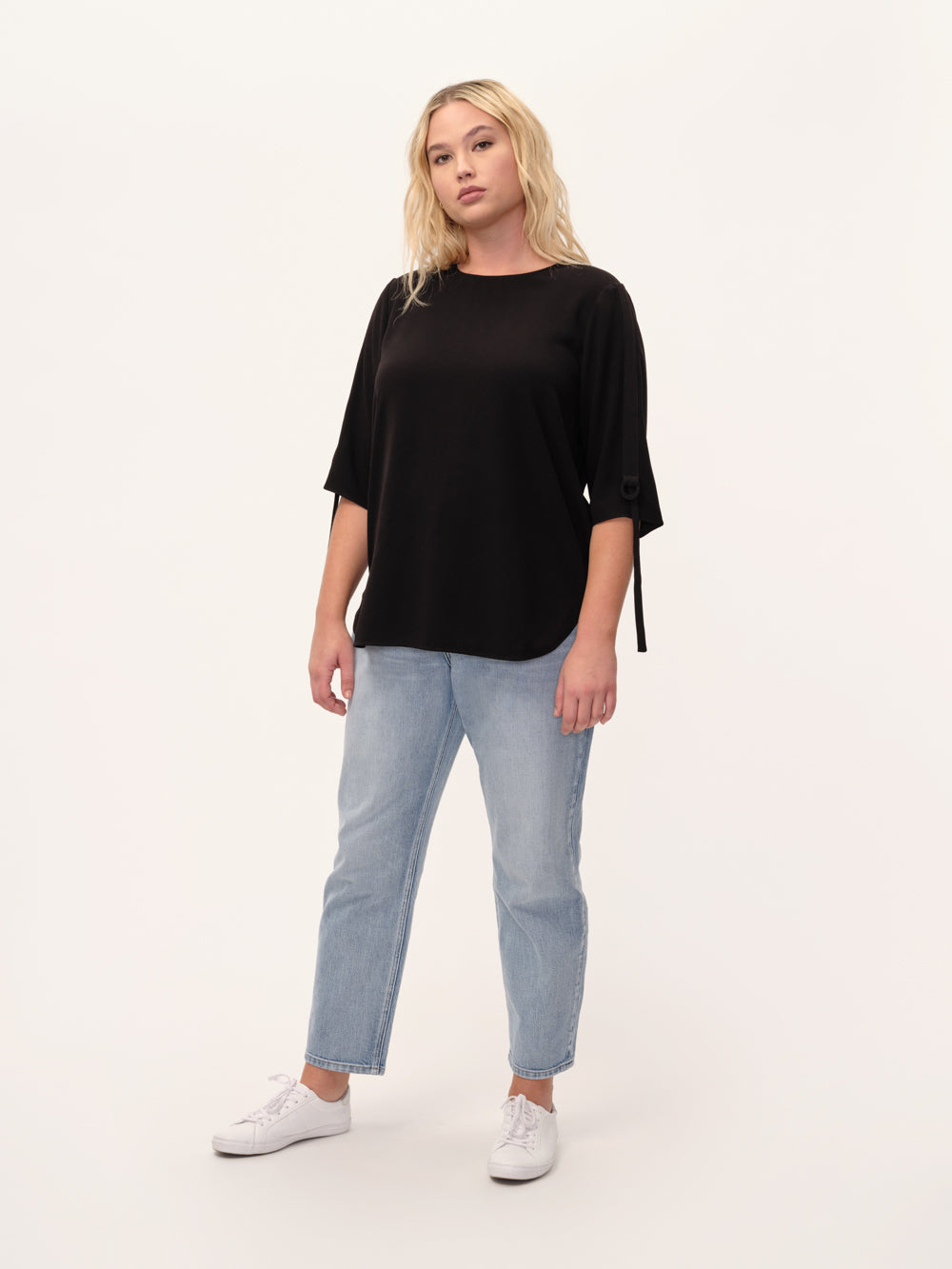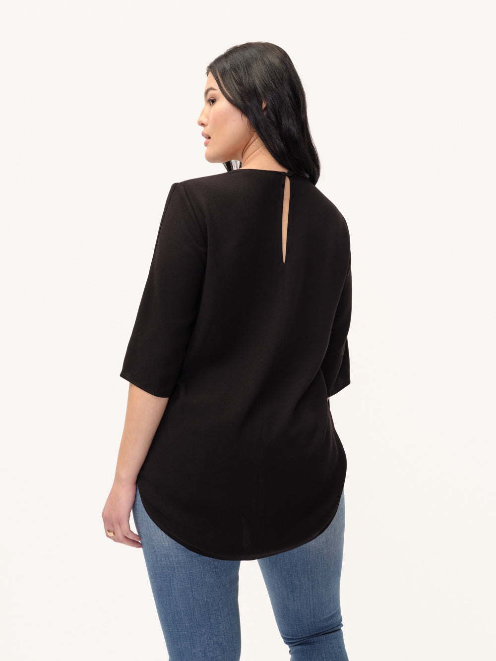 A polished tunic with adjustable drawstring sleeves—a luxe Japanese crepe top with dressed-up details.