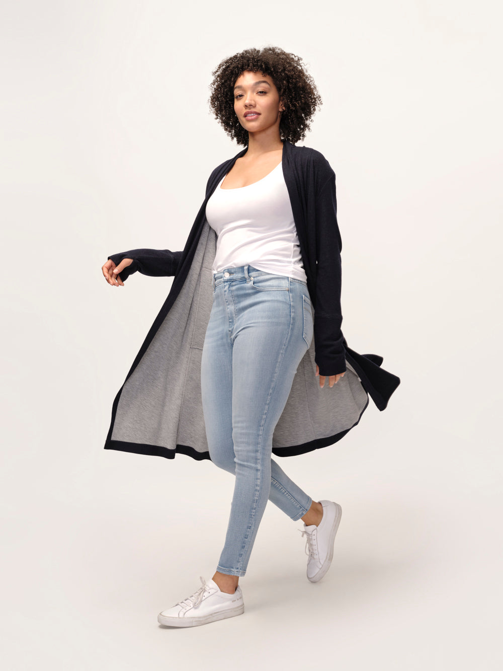 Just in case you catch a chill: this is a long, open-front cardigan with contrast internal lining—poised to be your new favorite, this one pairs well with literally anything.