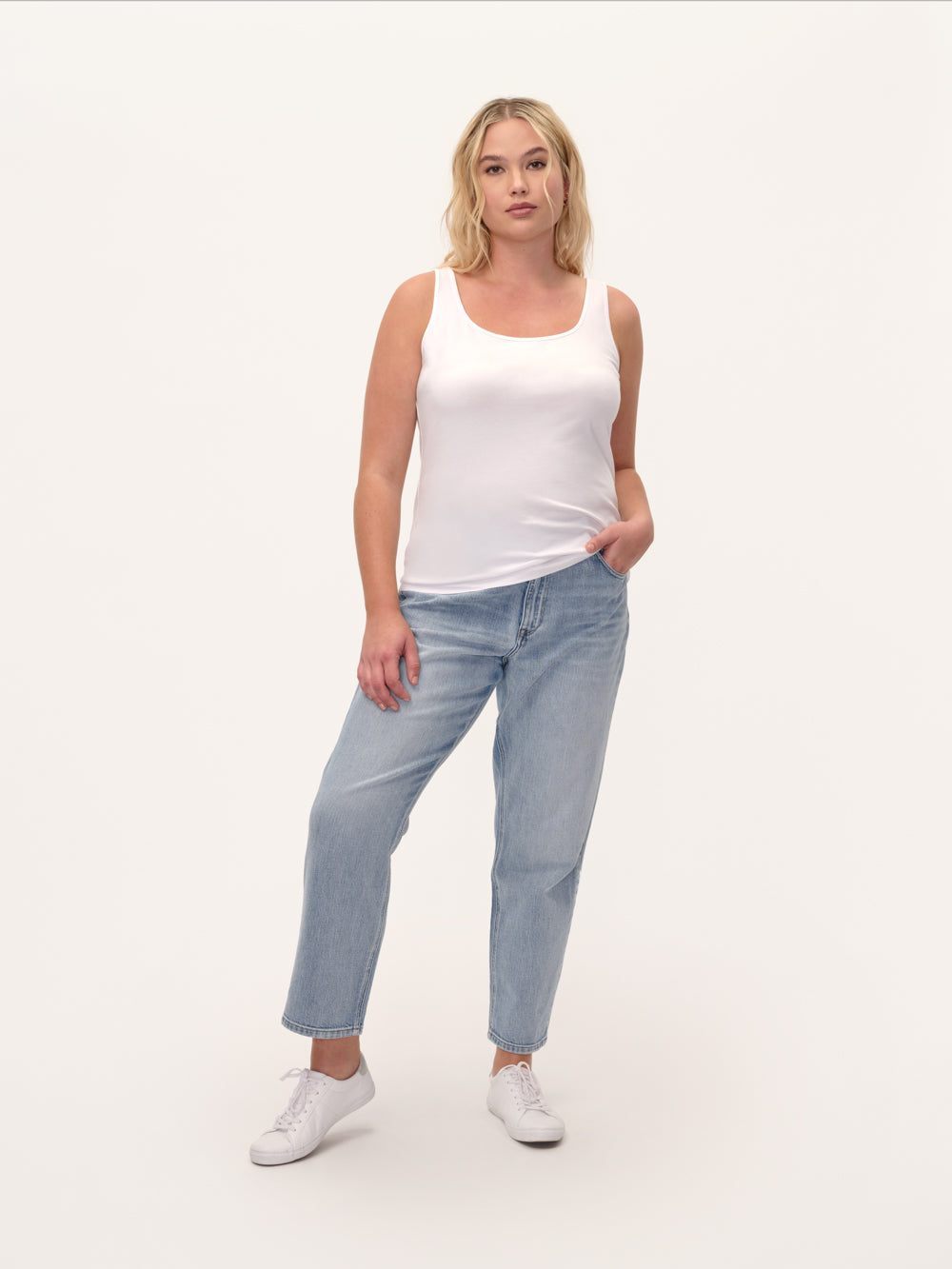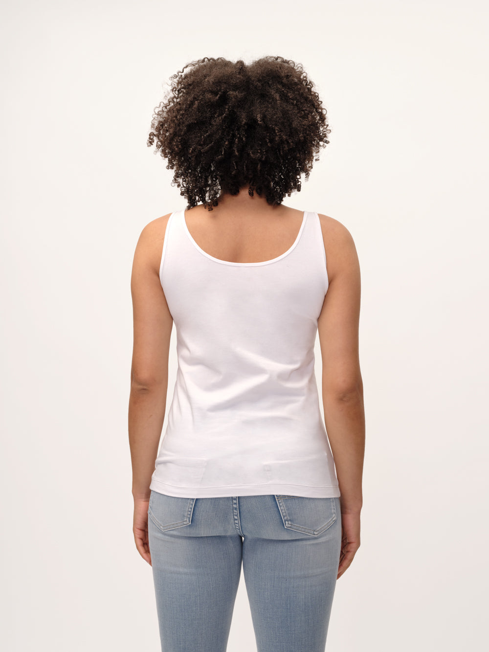 A fitted, scoop-neck cotton tank made from organic cotton with an added comfortable stretcha foundational, flattering layering piece.
