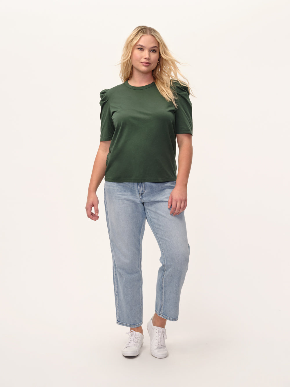 A sweet, soft cotton tee shirt with a gathered puff sleeve shouldergives any look an interesting, subtle silhouette