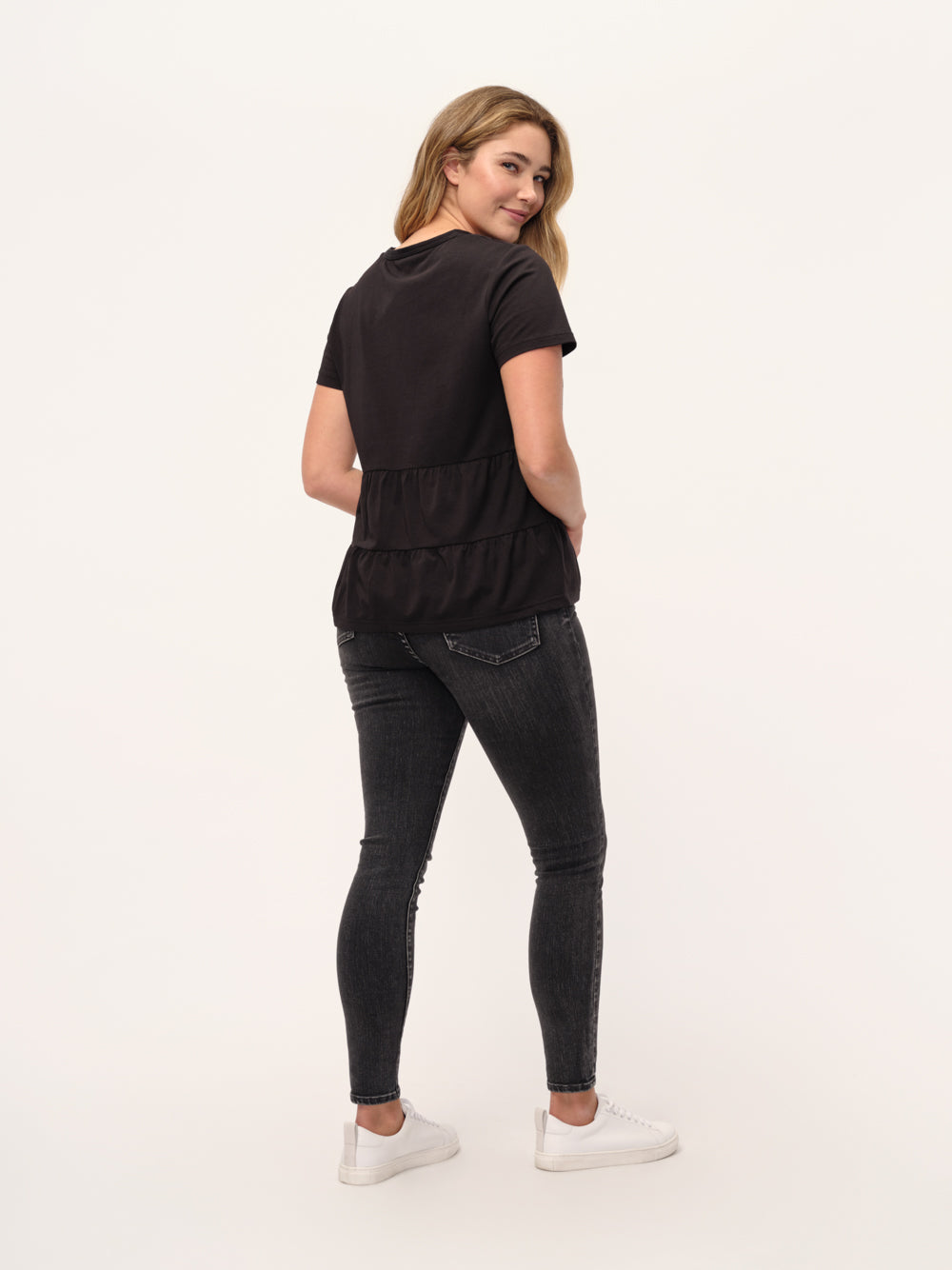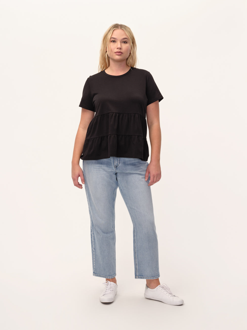 A simple, sweet cotton tee with a two-tiered design and a loose-fit hemsoft, slightly-stretchy fabric gives this shirt a subtle flowy feel.